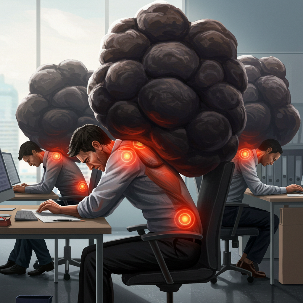 "책상 앞에 앉아 구부정한 자세로 일하는 사람의 옆모습, 광배근 부위가 강조된 일러스트, 뭉친 근육의 부담을 시각적으로 표현한 장면. 실내 배경과 밝은 톤의 자연스러운 조명."