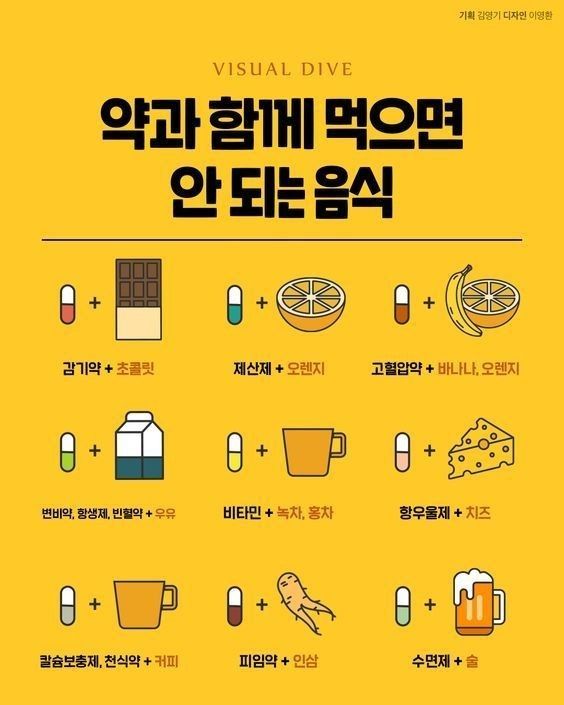 • 약과 음식의 관계를 이해하고 주의하면 부작용을 줄이고 약효를 극대화할 수 있습니다. 우리가 먹는 음식이 건강에 긍정적인 영향을 미칠 수 있도록 약 복용 시 신중하게 선택하세요. 올바른 정보와 실천으로 건강한 삶을 유지하시길 바랍니다.